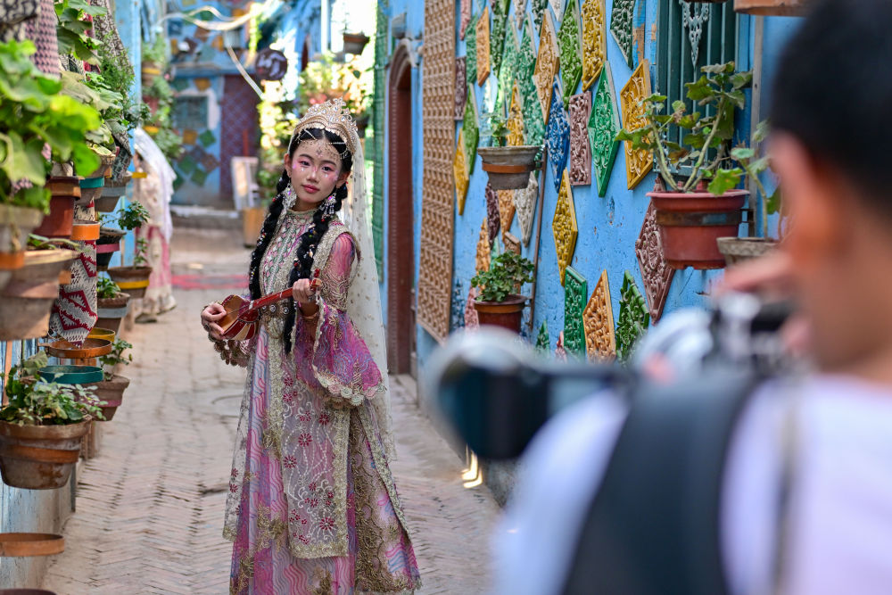 在新疆喀什古城景區(qū),游客體驗旅拍項目。新華社記者 丁磊 攝