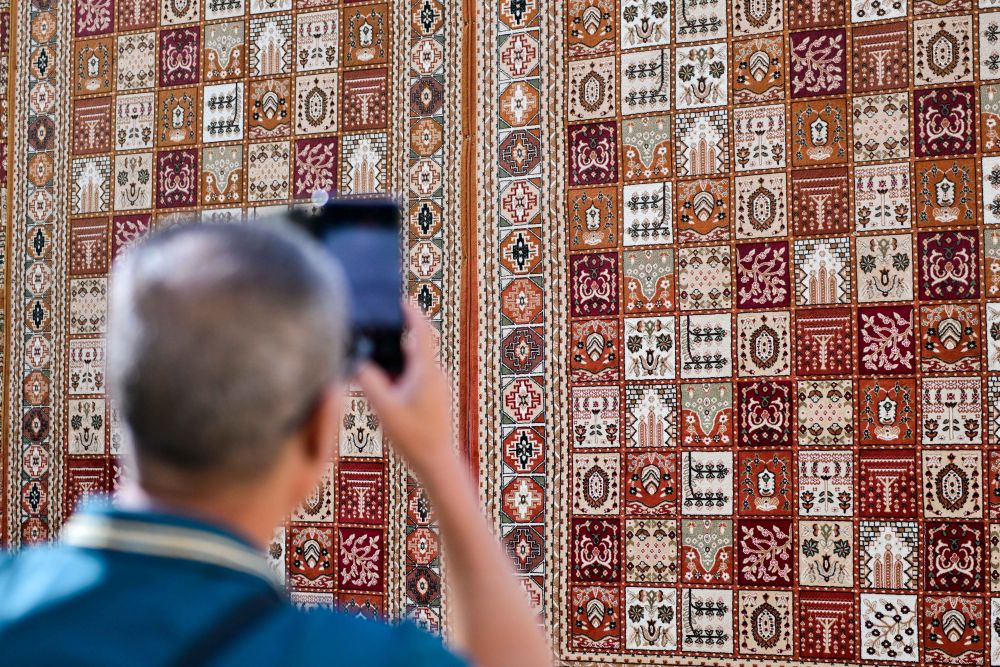 步入龜茲小巷,一幅巨大的地毯墻首先映入眼簾,地毯上大大小小的方格整齊排列,圖案精美對稱、色彩艷麗。地毯是新疆少數(shù)民族家庭中最常見的裝飾品,一般以羊毛剪裁編織而成,集繪畫、雕刻、編織、刺繡、印染等手工技藝于一體,是展現(xiàn)新疆民族風(fēng)情的典型物品之一。