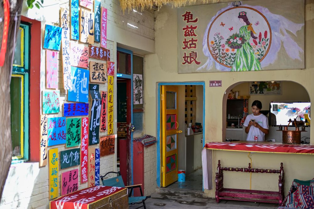 龜茲樂舞是中國傳統(tǒng)歌舞藝術(shù)中的一塊瑰寶,現(xiàn)存的克孜爾石窟壁畫中就描繪了天宮伎樂、飛天伎樂等內(nèi)容。在龜茲小巷,有一支樂舞表演團(tuán)隊每天在巷內(nèi)巡演?!白咂饋?、唱起來、演起來、互動起來,這也是傳承我們樂舞文化的一種形式?!睅燔囀形幕^館長羅志娟說。