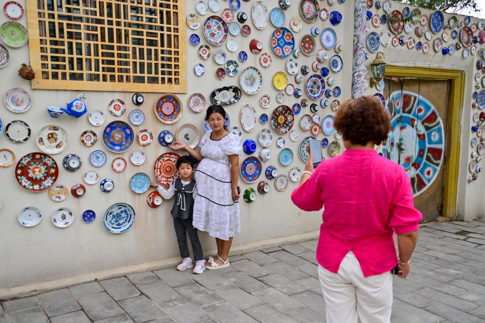 游客在新疆庫車市龜茲小巷拍照留念。新華社記者 丁磊 攝