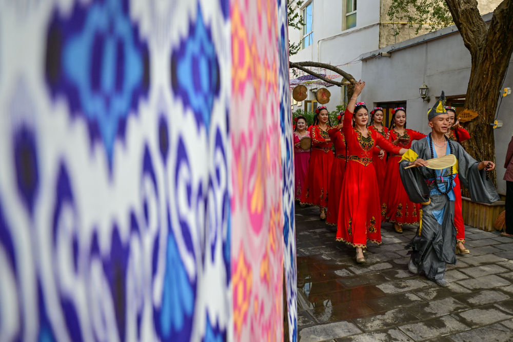 在新疆庫車市龜茲小巷,樂舞表演團(tuán)隊在小巷巡演。新華社記者 丁磊 攝