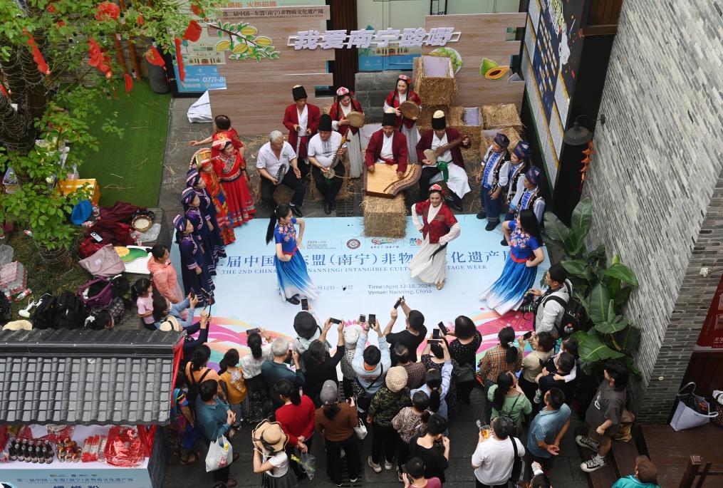 今年“三月三”期間,在南寧市三街兩巷的慶?;顒?dòng)現(xiàn)場(chǎng),多彩非遺文化展演吸引游客駐足欣賞。新華社記者陸波岸 攝