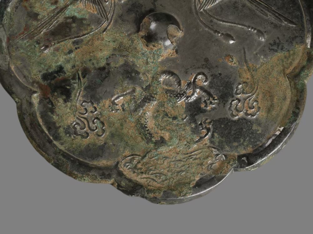 銅鏡呈八瓣葵花形,在中央的鏡鈕四周,自下而上分三個部分構(gòu)成了由水面到天空的立體空間。最下層為波光粼粼的一汪水面,雖然這一部分留存有因長期埋藏地下而產(chǎn)生的銹跡,但仍依稀可辨碧波之上有一條昂首翹尾的龍。它四肢張開,龍尾反折向龍首上方并纏繞于一足之上,龍身兩側(cè)各一朵祥云,襯托出神龍騰躍翻飛的身姿。