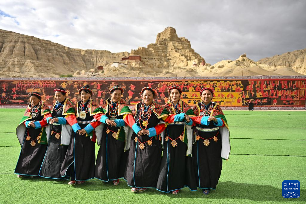 在西藏阿里地區(qū)札達(dá)縣古格王國(guó)遺址腳下,當(dāng)?shù)卮迕癖硌荨靶琛焙蠡ハ嘟涣鳎?月11日攝)。