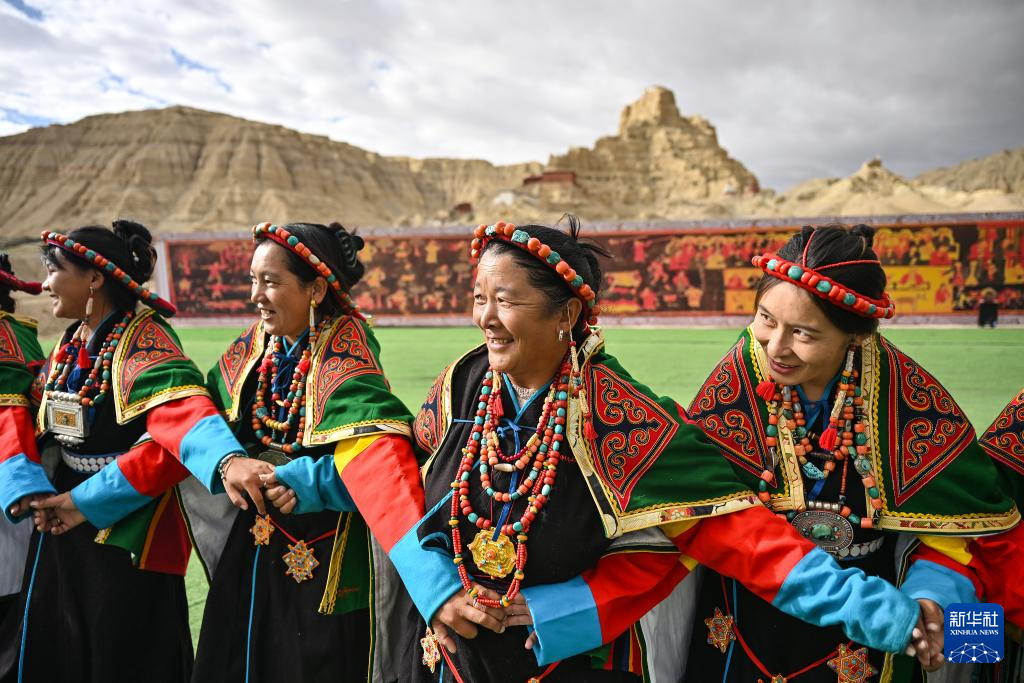 在西藏阿里地區(qū)札達(dá)縣古格王國(guó)遺址腳下,自治區(qū)級(jí)“宣舞”非遺傳承人央金(右)介紹“宣舞”(9月11日攝)。