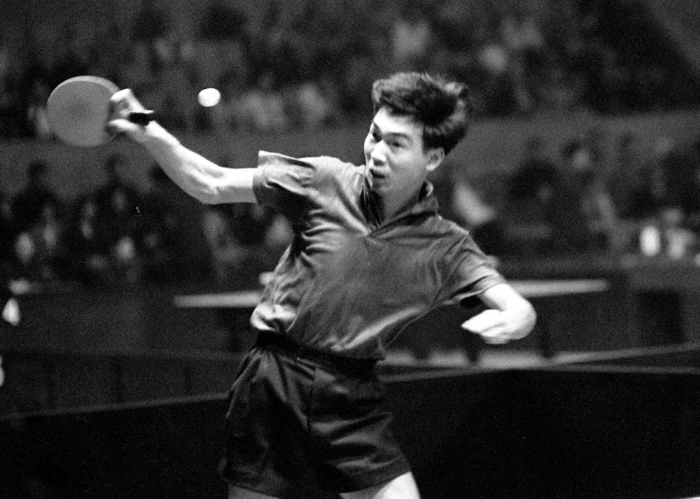 這是1961年4月11日,中國選手張燮林在第26屆世界乒乓球錦標賽單項比賽中。新華社記者 鄒健東 攝