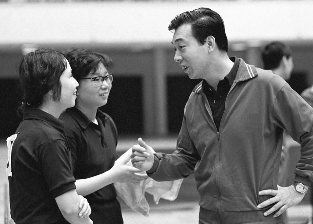 這是張燮林(右)在第35屆世界乒乓球錦標賽女子雙打比賽中指導葛新愛、閻桂麗(資料照片)。新華社記者 胡偉 攝