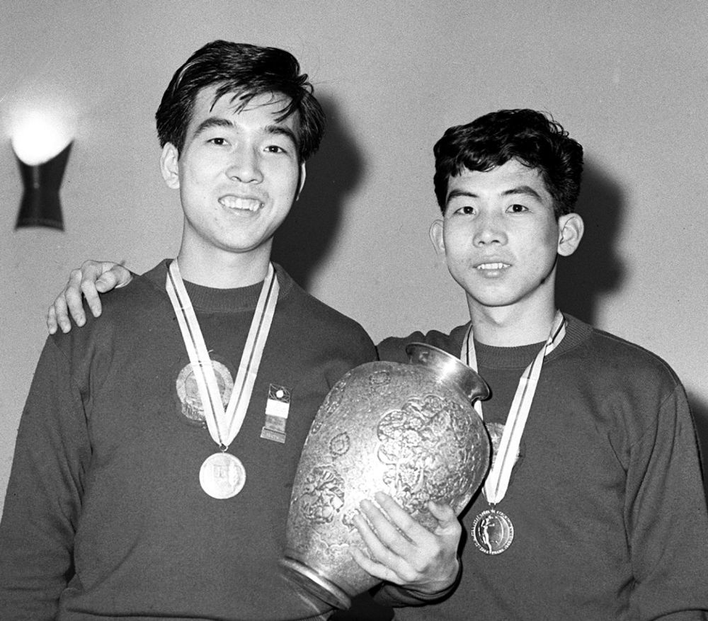 這是榮獲第27屆世界乒乓球錦標賽男子雙打冠軍的中國選手張燮林(左)、王志良(資料照片)。新華社記者 張家驊 攝
