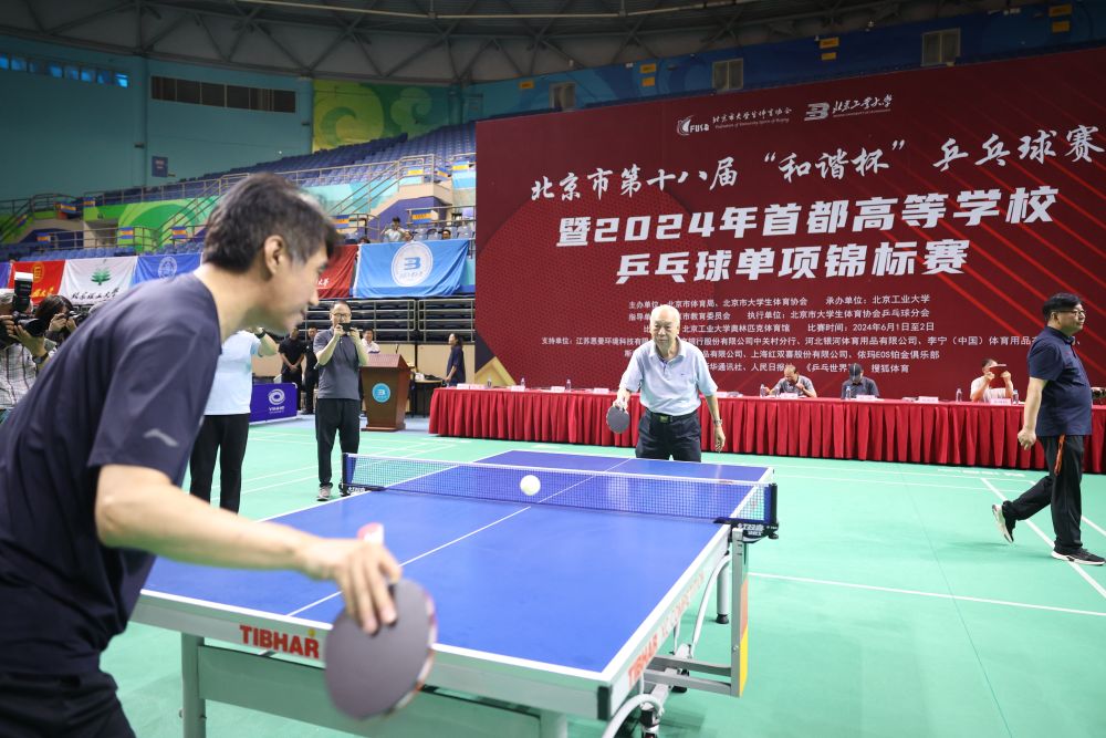 這是2024年6月1日,張燮林(后中)為北京市第十八屆“和諧杯”乒乓球賽暨2024年首都高等學校乒乓球單項錦標賽開球。新華社發(fā)