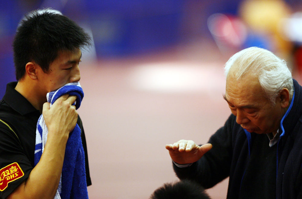 這是2007年2月9日,張燮林(右)在北京舉行的“直通薩格勒布”第49屆世乒賽單項賽國乒男隊選拔賽中為馬龍講解戰(zhàn)術要領。新華社記者 畢明明 攝