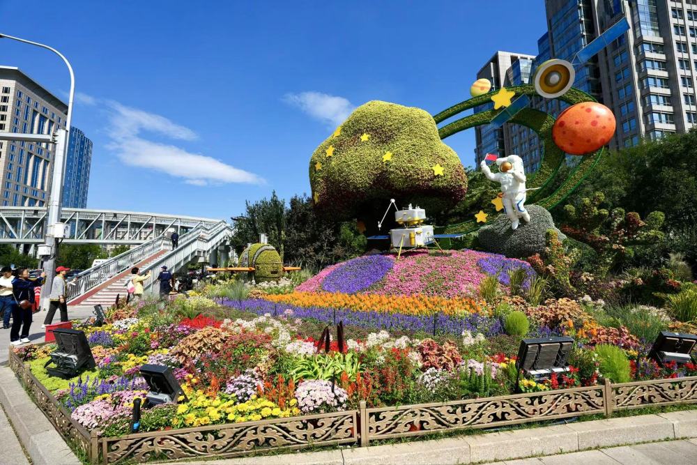 圖為9月25日拍攝的長(zhǎng)安街沿線建國(guó)門西北角“普天同慶”花壇。新華社記者 鞠煥宗 攝