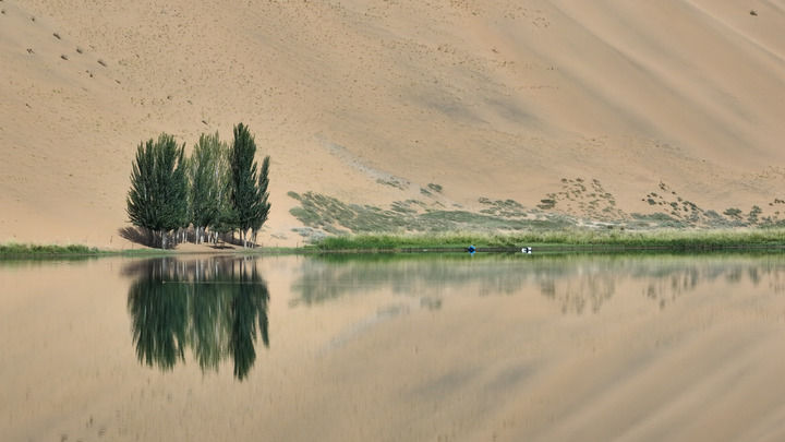 驅(qū)車深入巴丹吉林沙漠,翻過數(shù)不盡的沙丘,來到水草豐美的廟海子。這里四面環(huán)沙山,一座200多年前的白墻金頂寺廟坐落在湖邊,為雄渾壯闊的自然景象抹上一筆濃厚人文氣息。觀者無不感嘆,當(dāng)年交通不便,如何在沙漠腹地建成如此精美的建筑。