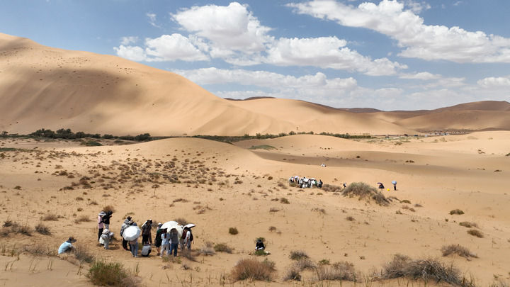 2024年7月31日,來自蘭州大學(xué)、香港浸會大學(xué)、西南大學(xué)等18所高校的100余位師生在巴丹吉林沙漠開展“發(fā)現(xiàn)計(jì)劃”地理學(xué)聯(lián)合實(shí)習(xí),這是部分師生在巴丹吉林沙漠中開展植被樣方調(diào)查(無人機(jī)照片)。