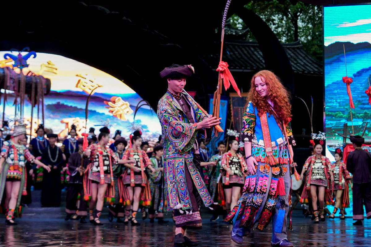 9月16日,美國(guó)青年學(xué)生在貴州省西江千戶(hù)苗寨體驗(yàn)民族歌舞。(圖片來(lái)源:新華社)