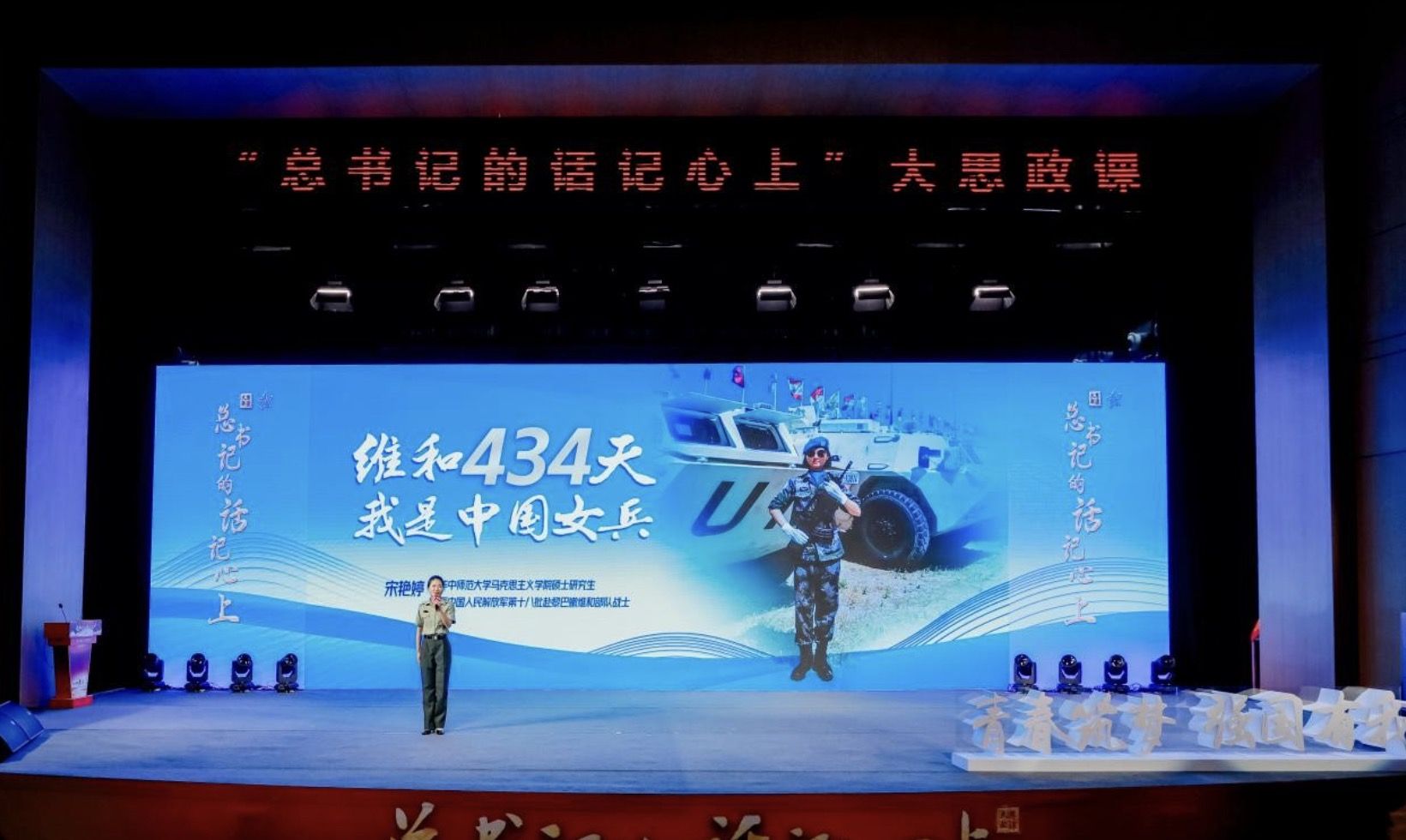 “大家好,我來自華中師范大學(xué)馬克思主義學(xué)院的宋艷婷!”9月24日,身著一身戎裝的宋艷婷身姿筆挺,在“總書記的話記心上”大思政課現(xiàn)場,向廣大學(xué)子講述她的維和故事。一個干脆利落的敬禮,引起現(xiàn)場的熱烈掌聲。她曾作為第十八批赴黎巴嫩維和建筑工兵分隊隊員,在黎巴嫩執(zhí)行維和任務(wù)。