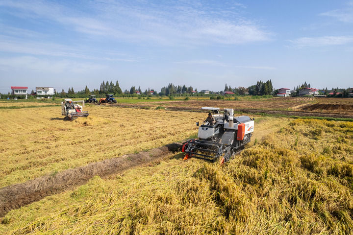 10月2日,湖南省益陽(yáng)市南縣麻河口鎮(zhèn)蔡家鋪村村民開(kāi)展水稻機(jī)械收割作業(yè)(無(wú)人機(jī)照片)。新華社記者 陳思汗 攝