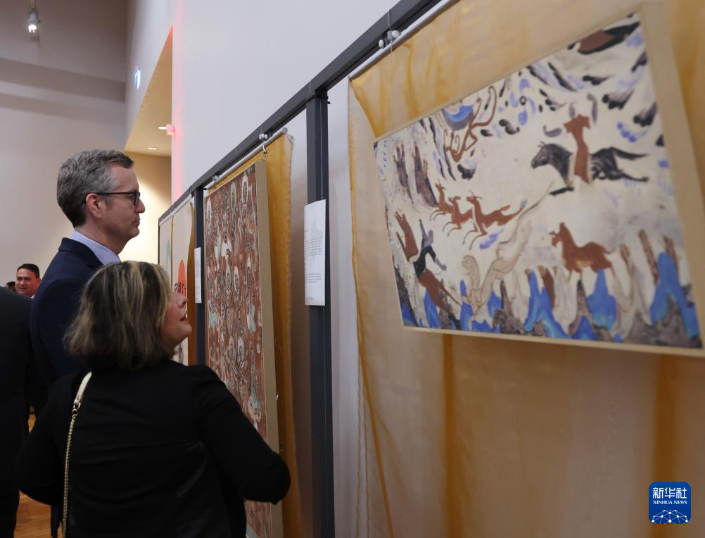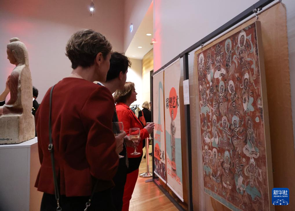 9月26日晚,在新西蘭首都惠靈頓舉行的中國(guó)駐新西蘭大使館國(guó)慶招待會(huì)上,嘉賓們駐足觀看敦煌文化展。新華社發(fā)(孟韜攝)