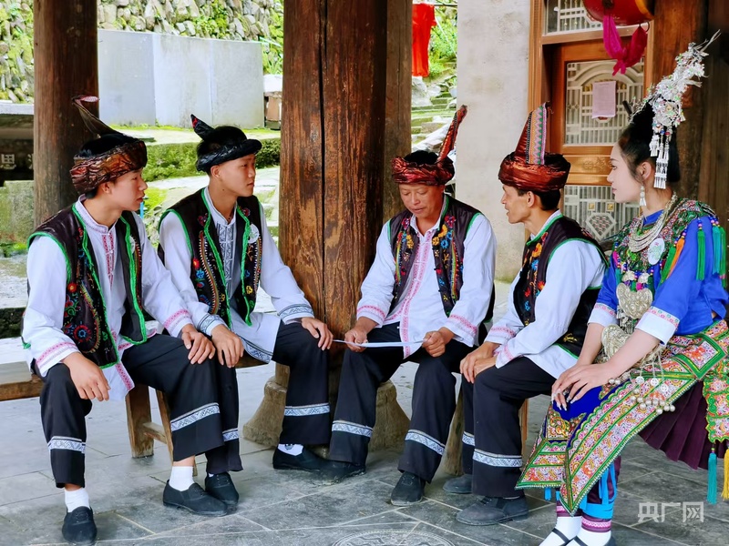 聶和香(右一)在鼓樓與村民共商侗寨文旅傳承(央廣網記者 欒小琳 攝)