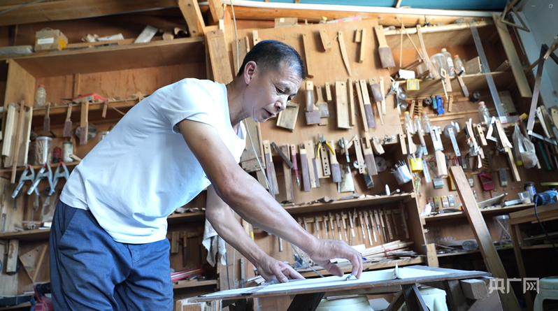 陸根衛(wèi)和兒子陸貴朋在制作鼓樓模型(央廣網發(fā) 張明輝 攝)
