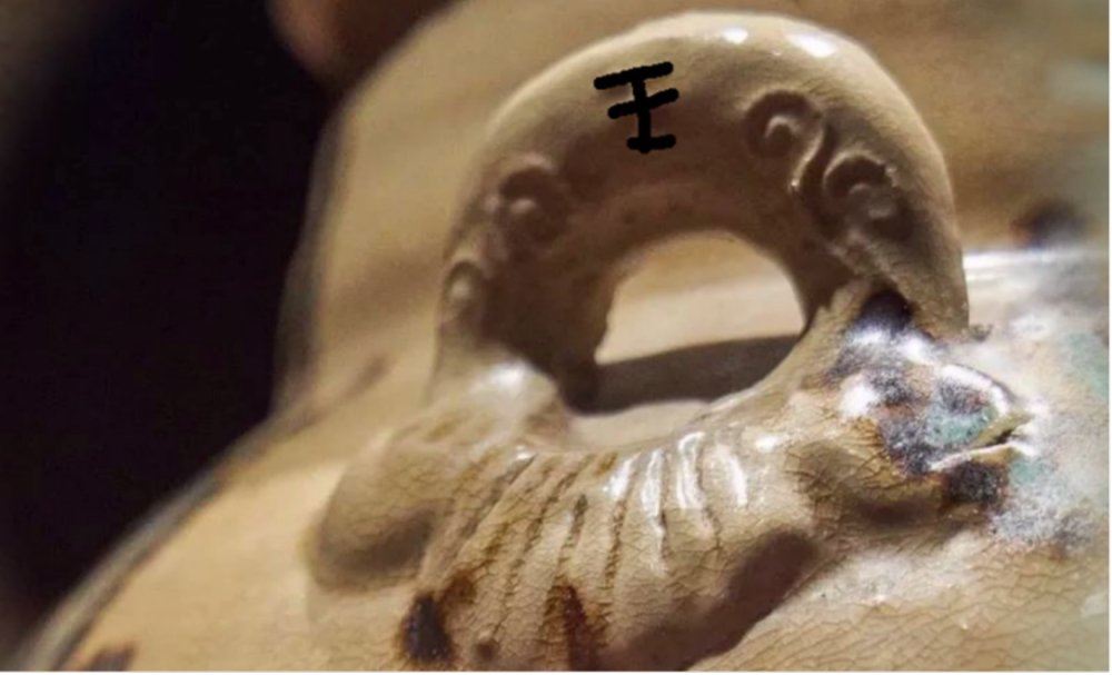 青釉褐綠點(diǎn)彩云紋雙耳罐的罐身印有“王”的字樣。圖片來源:揚(yáng)州日報(bào)社