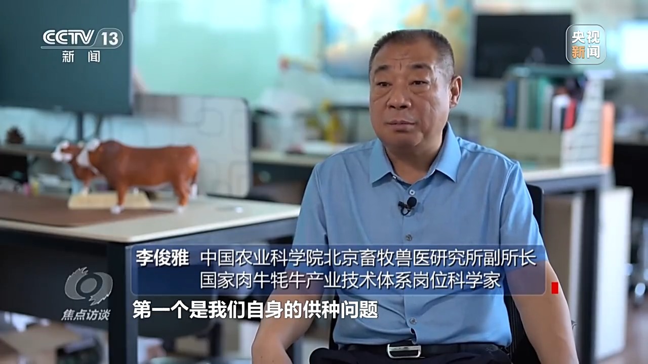 中國農業(yè)科學院北京畜牧獸醫(yī)研究所副所長、國家肉牛牦牛產(chǎn)業(yè)技術體系崗位科學家 李俊雅:“核心種源依然依靠進口,存在很多問題,一是我們自身的供種問題,在特殊時期,如果我們不能從國外進口相應的優(yōu)秀種質,我該怎么做;另外,我們引的這些國外的品種基本上都不是本品種的最優(yōu)秀種?;蛘叻N牛的凍精。我們必須要培育出滿足我們國家主流市場供給型的品種。