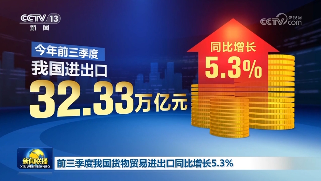 據(jù)海關(guān)統(tǒng)計(jì),今年前三季度,我國進(jìn)出口32.33萬億元,同比增長5.3%。其中出口18.62萬億元,增長6.2%;進(jìn)口13.71萬億元,增長4.1%。