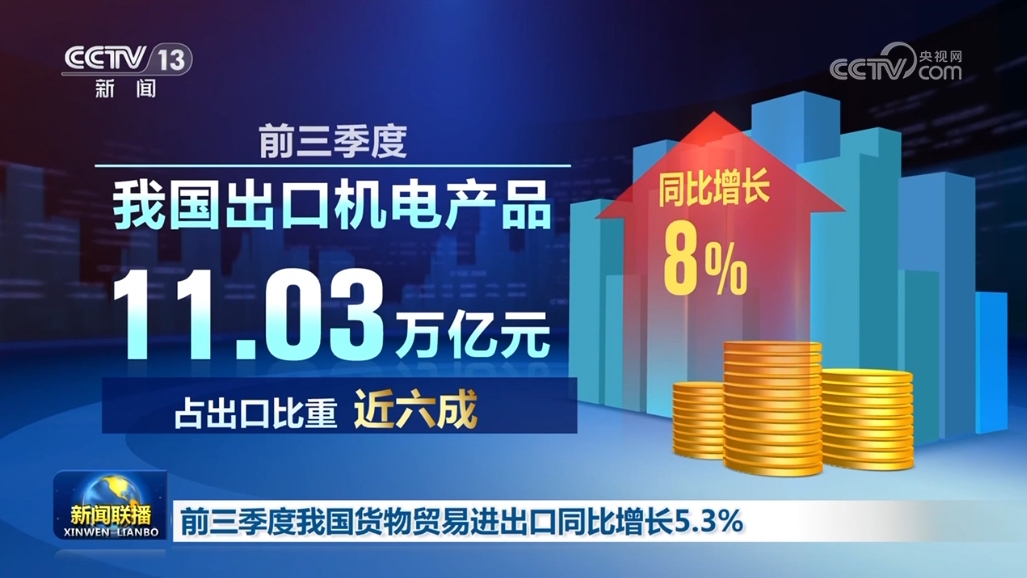 從國內(nèi)看,出口產(chǎn)品結(jié)構(gòu)持續(xù)優(yōu)化。前三季度,我國出口機(jī)電產(chǎn)品11.03萬億元,同比增長8%,占出口比重近六成。