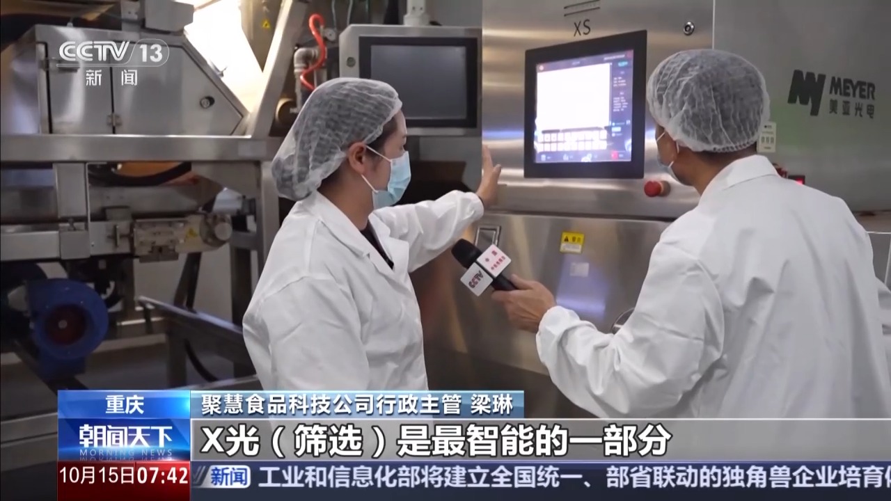 重慶聚慧食品科技公司行政主管 梁琳:X光篩選是最智能的一部分,可以達(dá)到99%的挑選率,后面再通過(guò)兩道人工篩選,保證辣椒100%去除異質(zhì),送到生產(chǎn)線。