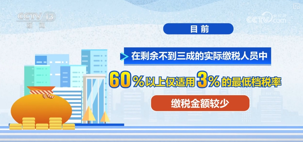 國家稅務總局稅收數(shù)據(jù)顯示,目前,我國取得綜合所得的人員中,無需繳納個稅的人員占比超過七成,在剩余不到三成的實際繳稅人員中,60%以上僅適用3%的最低檔稅率,繳稅金額較少。