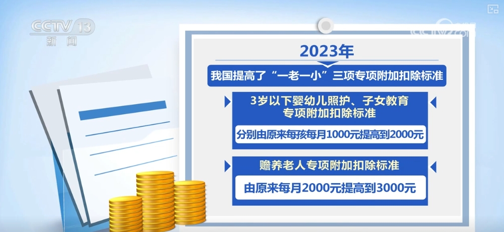 據(jù)介紹,2023年,我國提高了“一老一小”三項專項附加扣除標準。3歲以下嬰幼兒照護、子女教育專項附加扣除標準,分別由原來每孩每月1000元提高到2000元,贍養(yǎng)老人專項附加扣除標準由原來每月2000元提高到3000元。