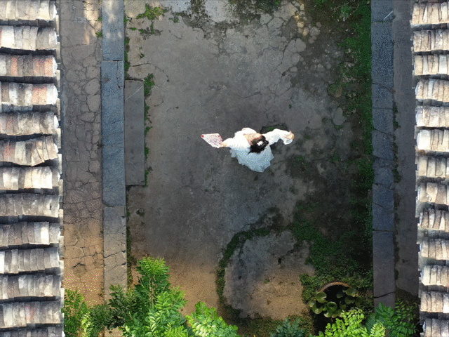 游客在廣西來(lái)賓市象州羅秀鎮(zhèn)納祿村的古宅中翩翩起舞(10月10日攝,無(wú)人機(jī)照片)。