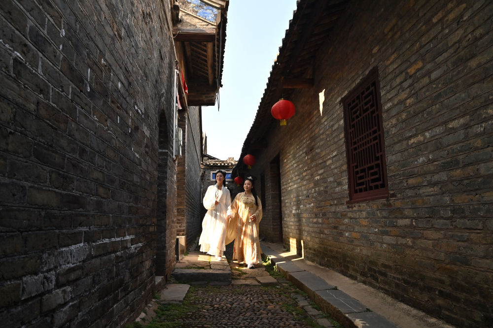 兩名游客行走在廣西來(lái)賓市象州羅秀鎮(zhèn)納祿村的古巷中(10月9日攝)。