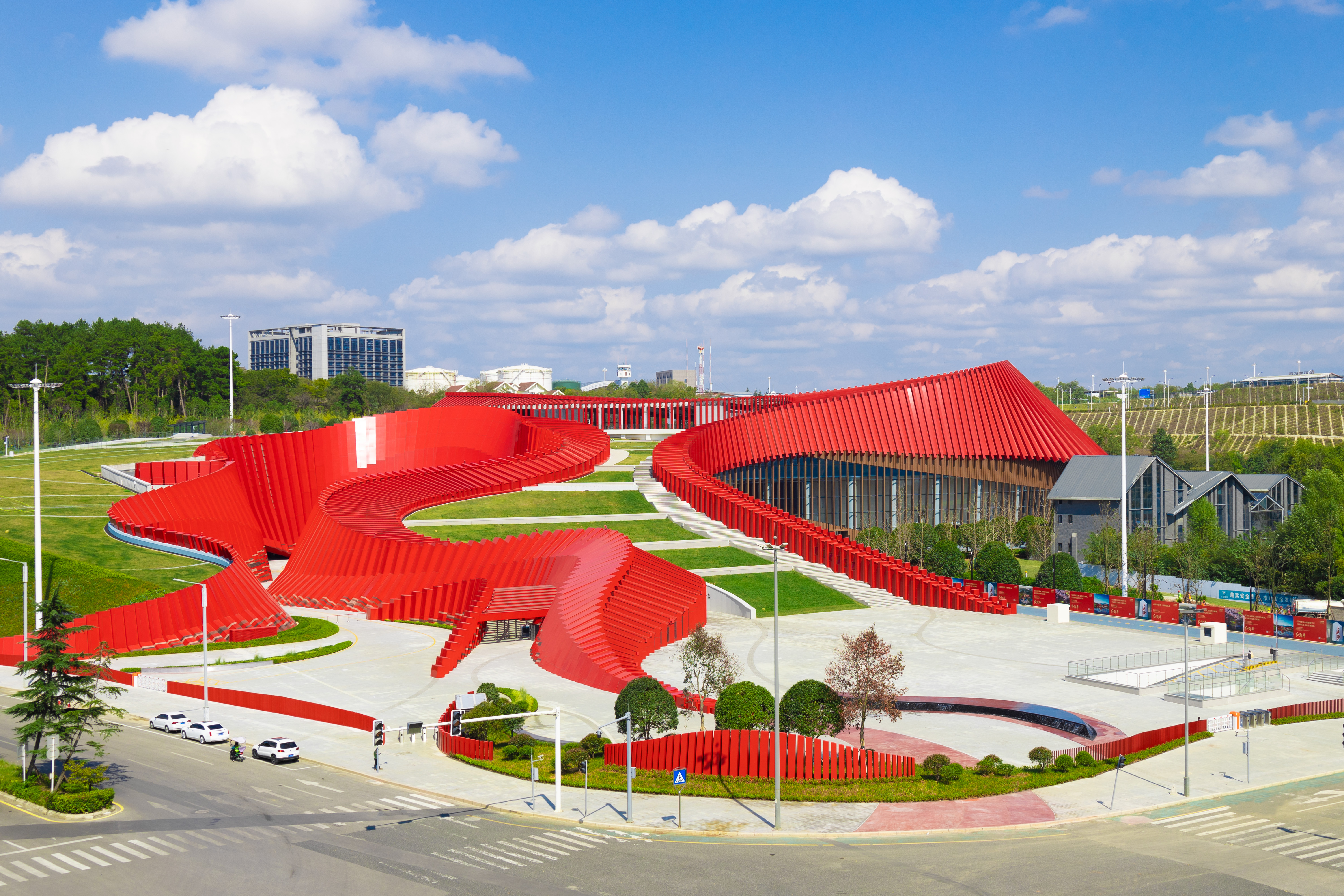 乘坐航班前往貴陽的游客,若在貴陽龍洞堡機場上空俯瞰,可發(fā)現(xiàn)有一座巨型建筑鋪展在青山綠水之間。它由一塊塊紅色的曲面幕墻構(gòu)成,此起彼伏,形成了連續(xù)轉(zhuǎn)折的動態(tài)輪廓,猶如一條靈動的“紅飄帶”。它就是全國首個以長征為主題的全域沉浸式數(shù)字科技體驗館,也是長征國家文化公園貴州重點建設區(qū)的標志性、引領(lǐng)性工程。