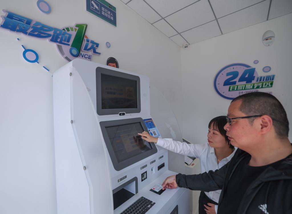 2024年5月9日,在浙江省嘉興市秀洲區(qū)王江涇鎮(zhèn)便民服務(wù)中心,工作人員指導居民對在蘇州工作期間的社保繳費記錄進行自助跨省查詢。新華社記者 徐昱 攝