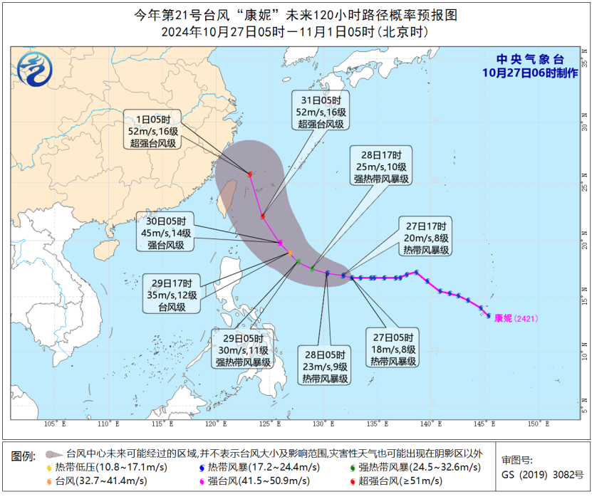 預(yù)計(jì),“康妮”將以每小時(shí)10至15公里的速度向偏西方向移動(dòng)。29日開始轉(zhuǎn)向西北方向移動(dòng),逐漸向臺(tái)灣島東部海面靠近,強(qiáng)度逐漸增強(qiáng),最強(qiáng)可達(dá)強(qiáng)臺(tái)風(fēng)級或超強(qiáng)臺(tái)風(fēng)級(48至55米/秒,15至16級)。
