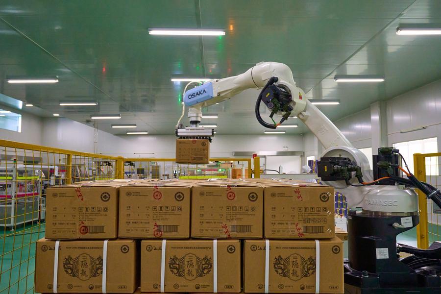 貴州山王果健康實(shí)業(yè)有限公司5G智慧工廠全自動包裝線正在工作。(新華社發(fā))