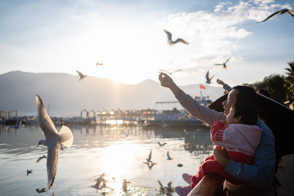 市民在云南滇池畔投喂紅嘴鷗(2022年10月20日攝)。新華社記者 王冠森 攝