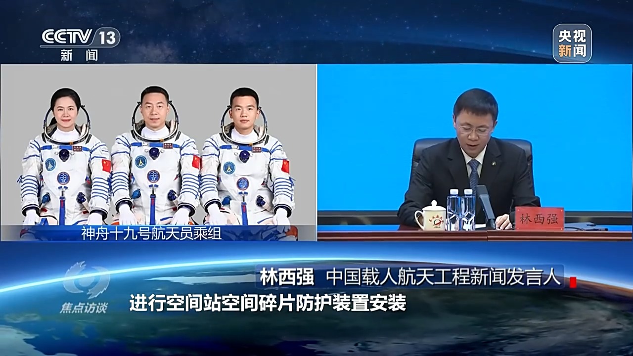 中國載人航天工程新聞發(fā)言人 林西強:此次任務在空間站駐留約六個月,開展空間科學與應用實(試)驗,實施航天員出艙活動及貨物進出艙,進行空間站空間碎片防護裝置安裝,艙外載荷和艙外設備安裝與回收等任務,開展科普教育和公益活動以及空間搭載試驗。