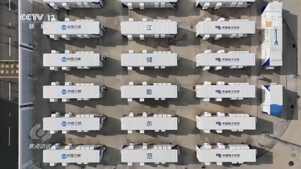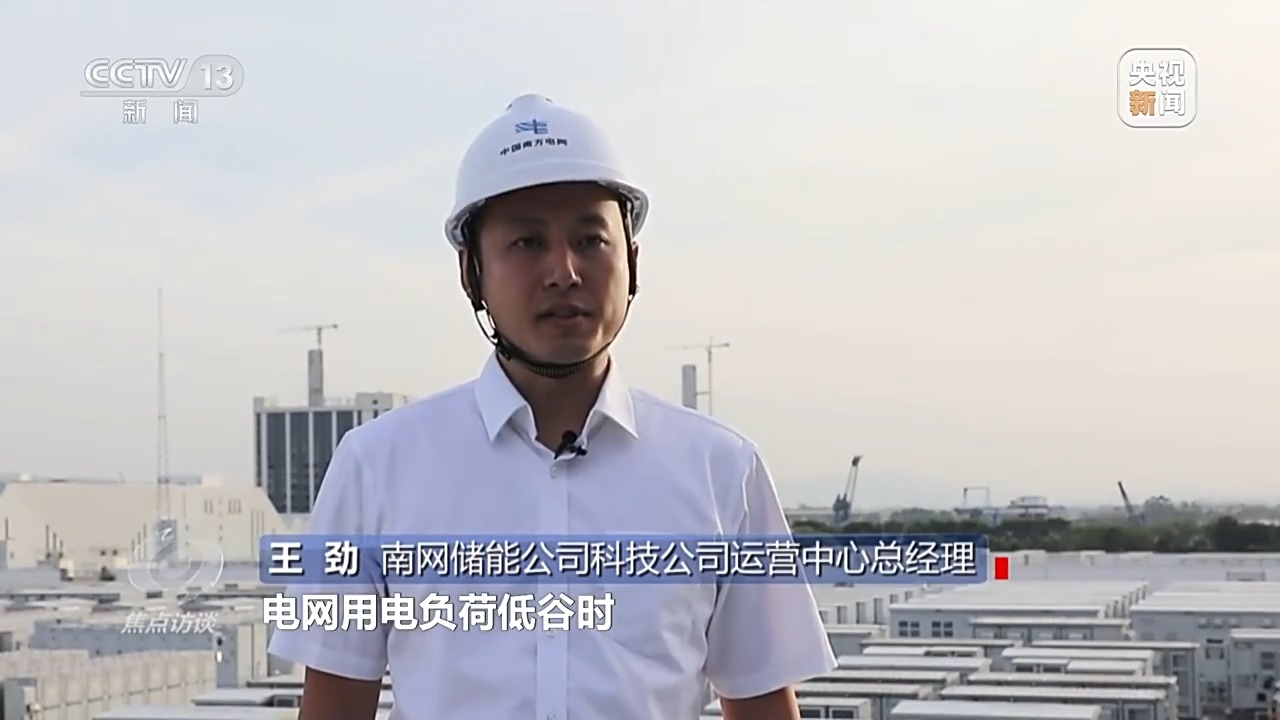 南網(wǎng)儲能公司科技公司運營中心總經(jīng)理 王勁:電網(wǎng)用電負荷低谷時,把電廠發(fā)出的多余的電儲存到250個電池儲能柜內(nèi),用電高峰時,把電池儲能柜里的電能釋放出來支持電網(wǎng)的電力供應(yīng)。