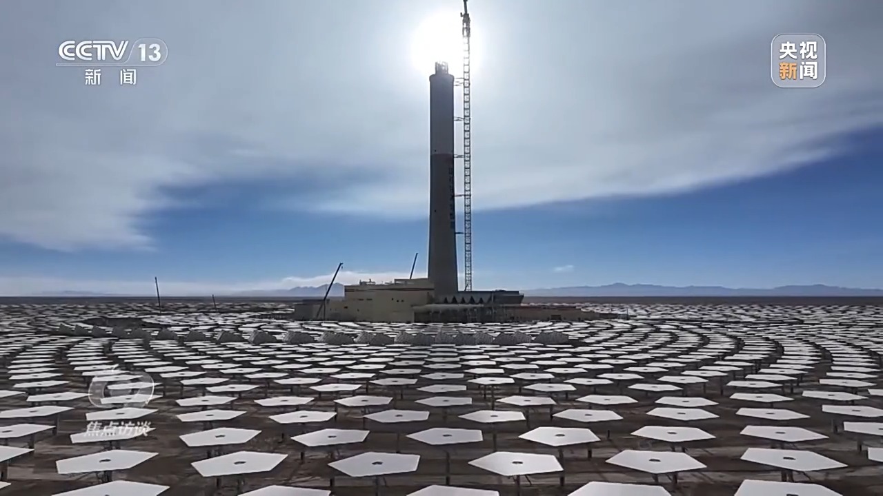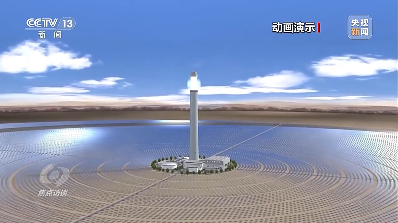 電站通過高精度智能定日鏡,實時跟蹤太陽的運動,將太陽直接輻射光反射聚集到吸熱塔上,將吸熱塔內(nèi)的熔鹽加熱到560多℃的高溫,將高溫的熔鹽進行儲存,在需要發(fā)電時再通過高溫熔鹽與水進行熱交換,產(chǎn)生高溫高壓的蒸汽,驅(qū)動汽輪發(fā)電機組發(fā)電。