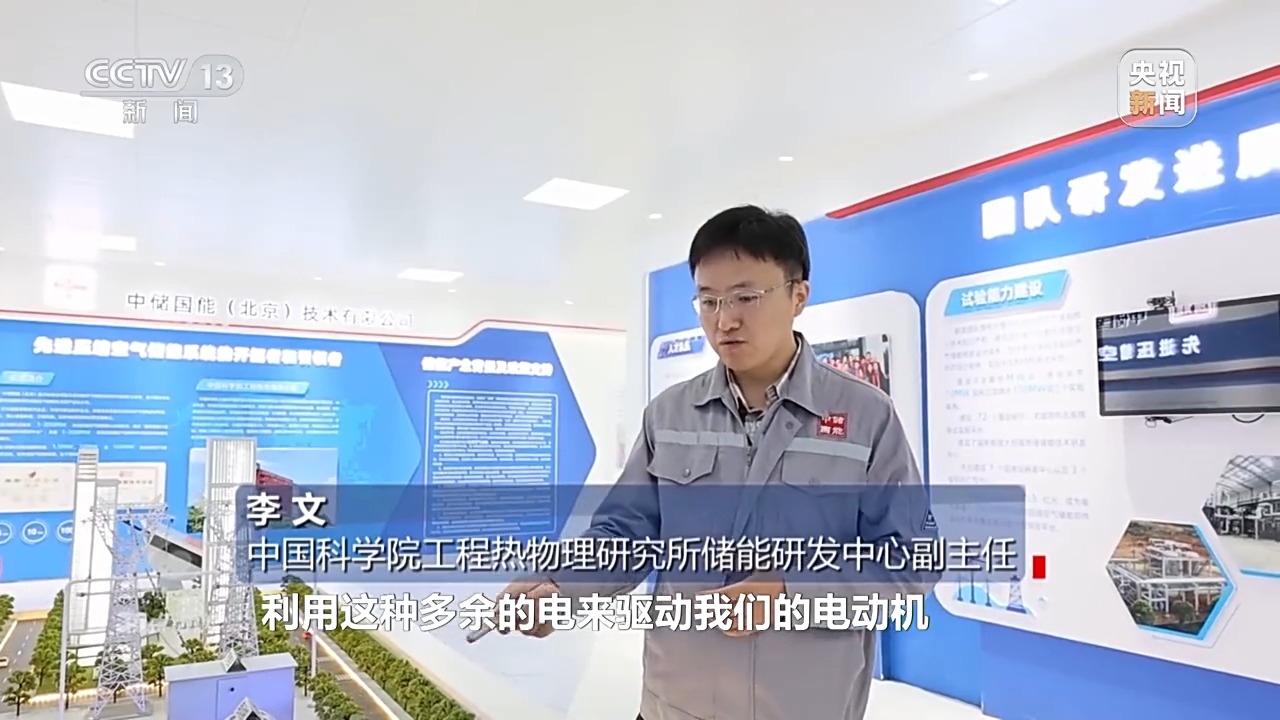 中國科學院工程熱物理研究所儲能研發(fā)中心副主任 李文:利用多余的電來驅(qū)動電動機,帶動壓縮機把空氣壓縮到高壓狀態(tài),最后存儲到儲氣裝置中,在有需要的時候,我們利用所存儲的高壓空氣來驅(qū)動膨脹機,帶動發(fā)電機進行做功發(fā)電。