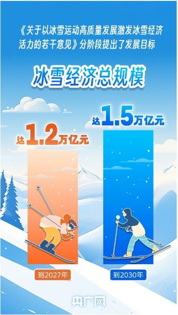 近日,國(guó)務(wù)院辦公廳公開(kāi)發(fā)布《關(guān)于以冰雪運(yùn)動(dòng)高質(zhì)量發(fā)展激發(fā)冰雪經(jīng)濟(jì)活力的若干意見(jiàn)》(以下簡(jiǎn)稱《意見(jiàn)》),分階段提出發(fā)展目標(biāo):到2027年,冰雪運(yùn)動(dòng)場(chǎng)地設(shè)施更加完善,服務(wù)水平顯著提升,冰雪運(yùn)動(dòng)更加廣泛開(kāi)展,冰雪經(jīng)濟(jì)總規(guī)模達(dá)1.2萬(wàn)億元。到2030年,冰雪經(jīng)濟(jì)主要產(chǎn)業(yè)鏈條實(shí)現(xiàn)高水平協(xié)調(diào)融合發(fā)展,冰雪消費(fèi)成為擴(kuò)大內(nèi)需的重要增長(zhǎng)點(diǎn),冰雪經(jīng)濟(jì)總規(guī)模達(dá)1.5萬(wàn)億元。