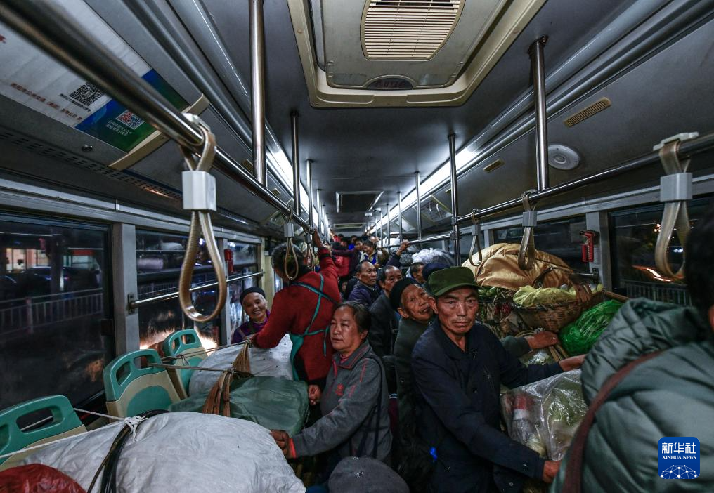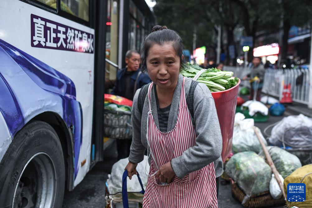 菜農(nóng)從貴陽市烏當(dāng)區(qū)水田鎮(zhèn)定扒村乘坐252路“惠農(nóng)專線”公交車進(jìn)城賣菜(11月7日攝)。