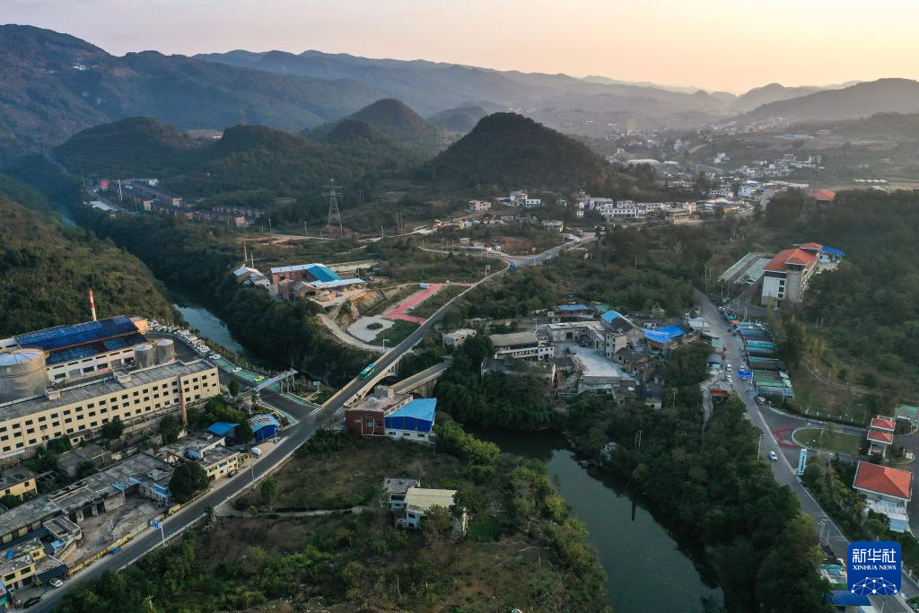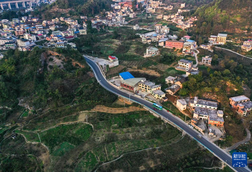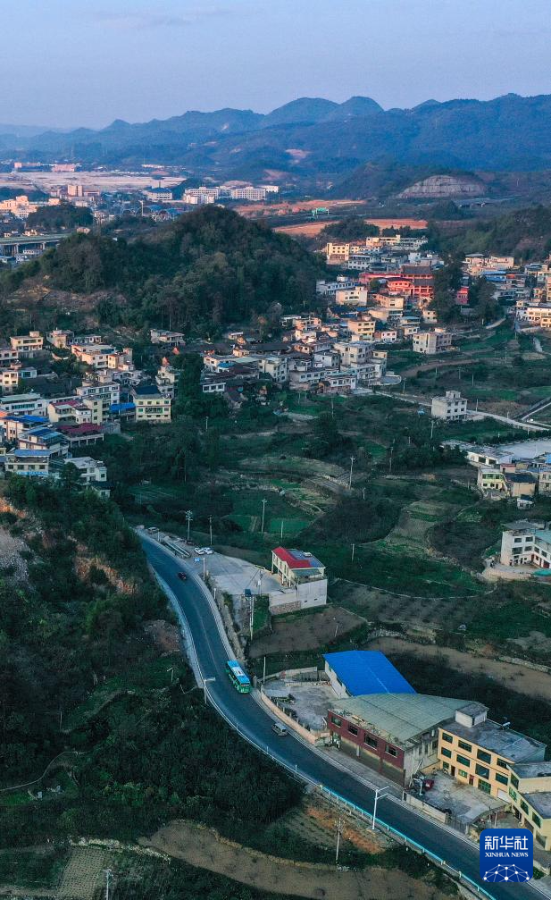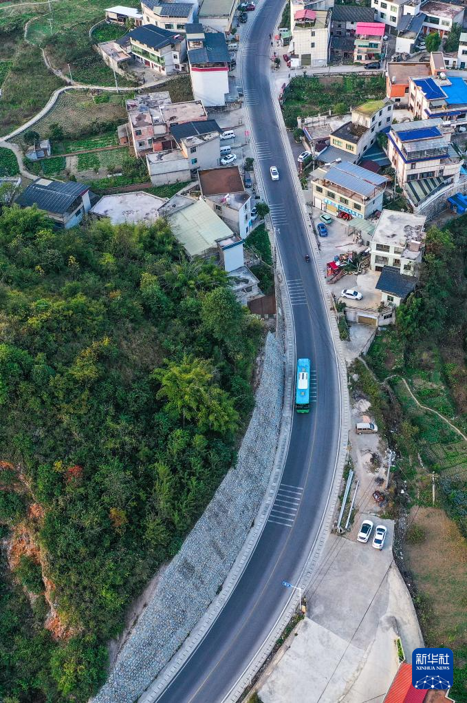 11月10日,252路公交車行駛在貴陽市烏當(dāng)區(qū)水田鎮(zhèn)境內(nèi)(無人機照片)。