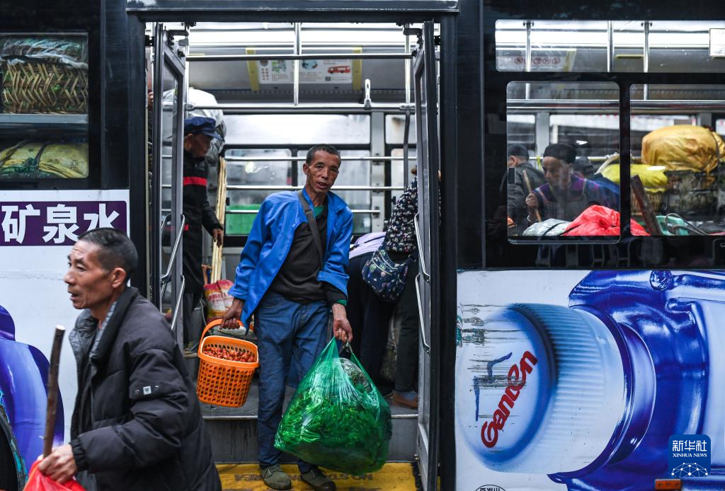 在貴陽市烏當(dāng)區(qū)水田鎮(zhèn)定扒村,菜農(nóng)登上252路“惠農(nóng)專線”公交車,準(zhǔn)備進(jìn)城賣菜(11月7日攝)。