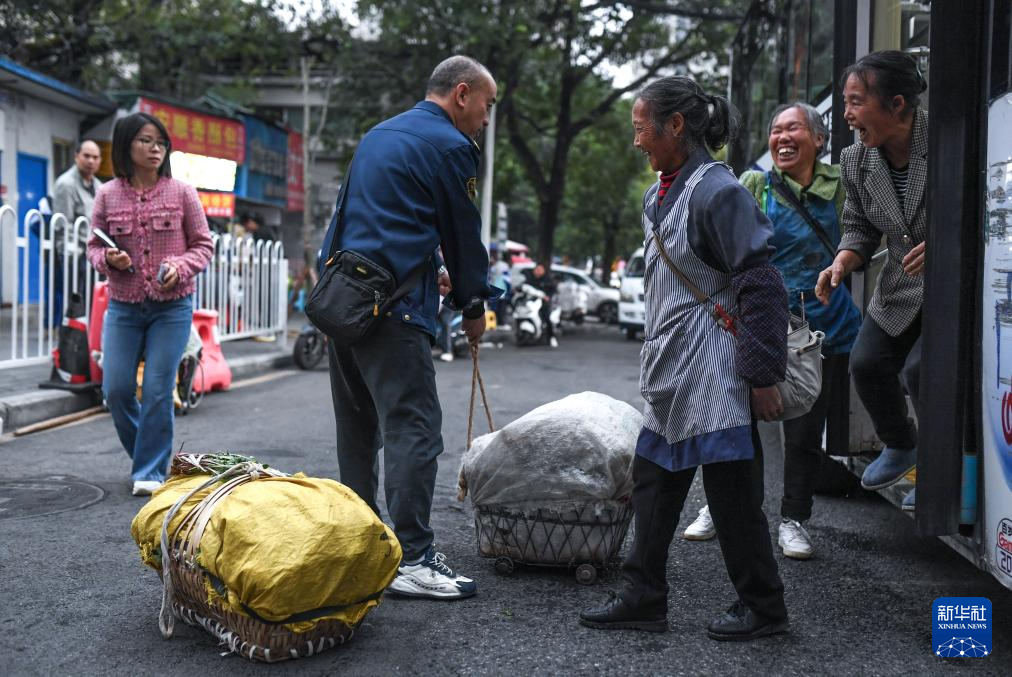 菜農(nóng)乘坐252路“惠農(nóng)專線”公交車抵達(dá)貴陽市大營坡終點站下車時與搭手幫忙的駕駛員交談(11月7日攝)。