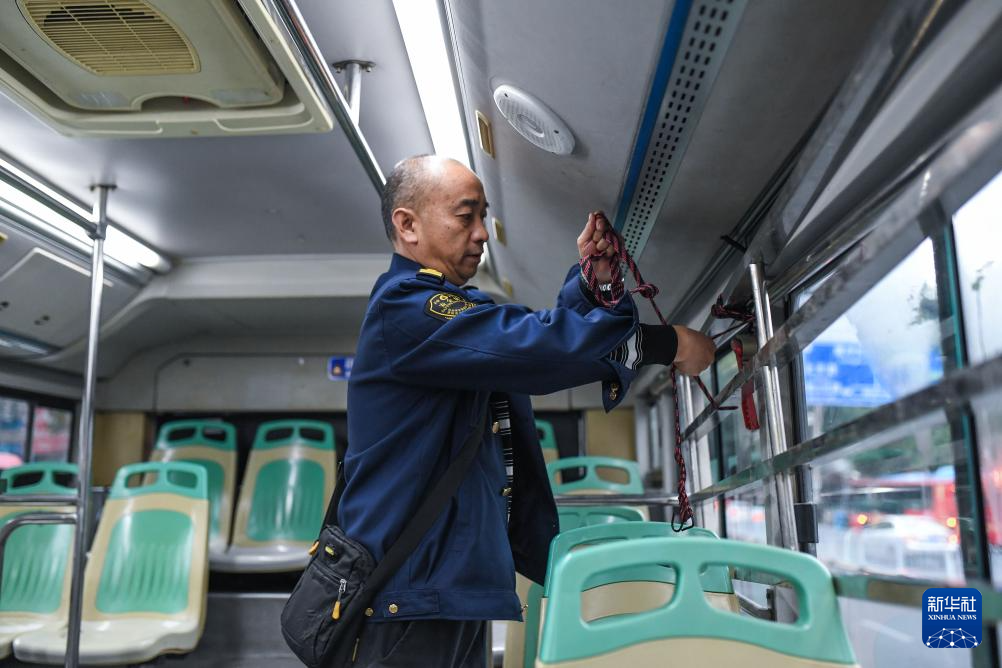 司機張桂林在252路“惠農(nóng)專線”公交車抵達(dá)貴陽市大營坡終點站后整理置物架(11月7日攝)。