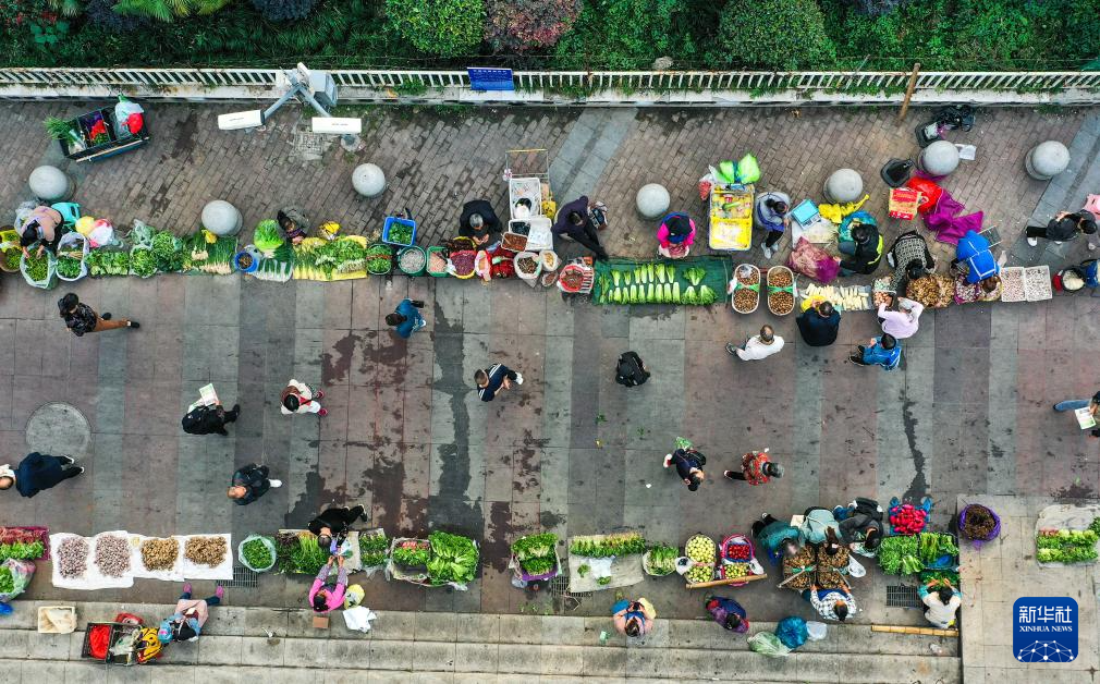11月11日,市民在貴陽市大營坡附近選購“惠農(nóng)專線”公交車運送來的新鮮農(nóng)產(chǎn)品(無人機照片)。