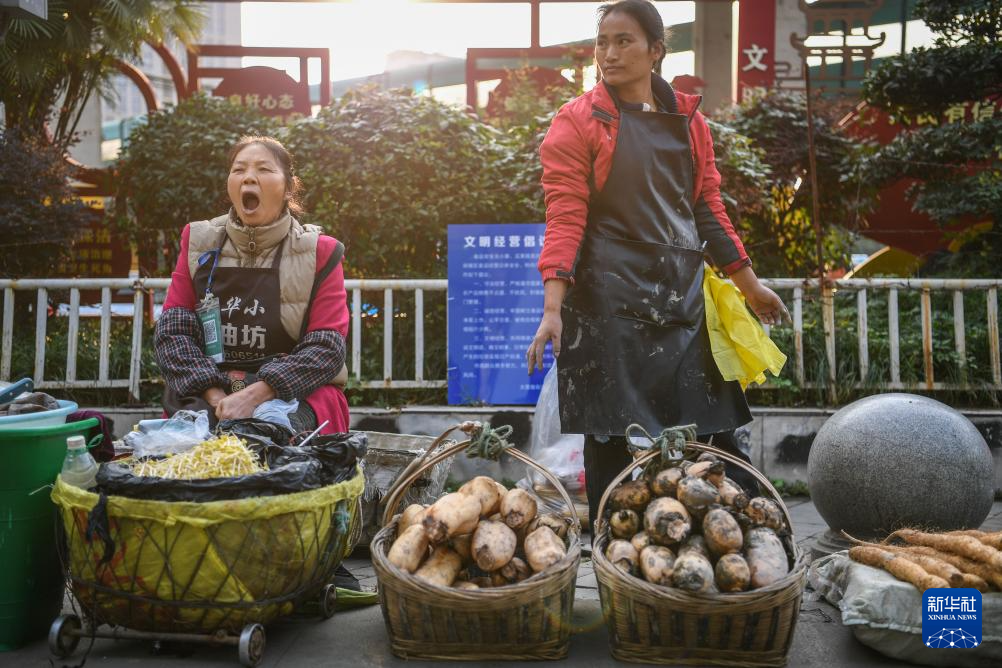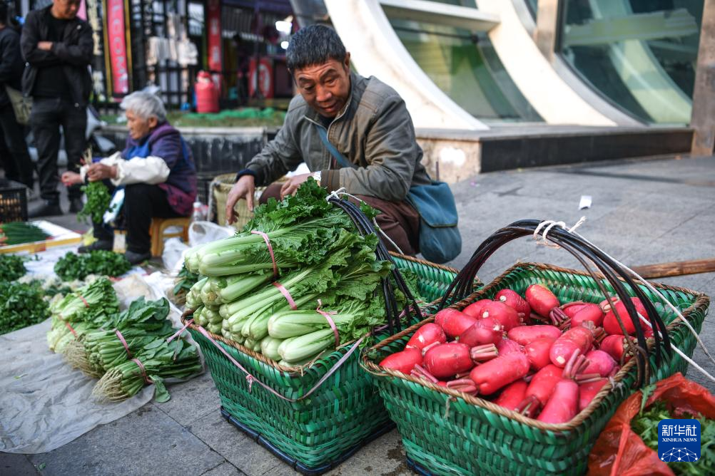 乘坐252路“惠農(nóng)專線”公交車進(jìn)城的菜農(nóng)在貴陽市大營坡附近賣菜(11月7日攝)。