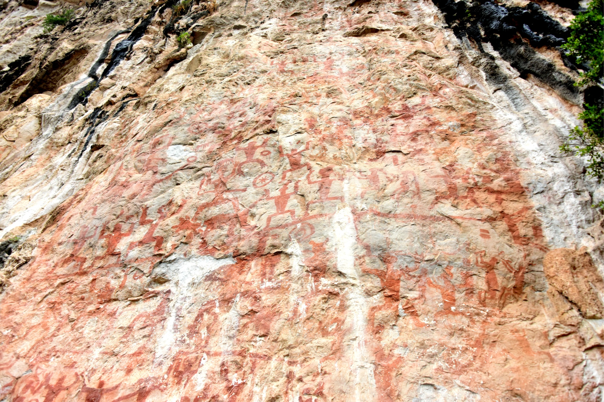 花山,坐落于崇左市寧明縣城西北約25公里的明江河畔,以其古老神奇的巖畫而聞名海內(nèi)外?;ㄉ綆r畫距今已有2000多年的歷史,刻著人、獸、銅鼓、刀劍、羊角鈕鐘等造型各異的赭紅色圖像,記錄著壯族先民古駱越人的生活、生產(chǎn)和宗教信仰,為中國首個(gè)巖畫類世界文化遺產(chǎn)。
